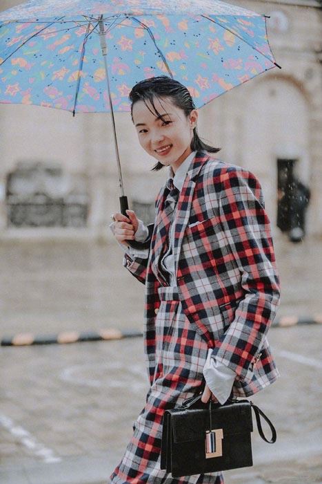 雎晓雯格纹西装套装复古时