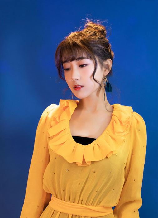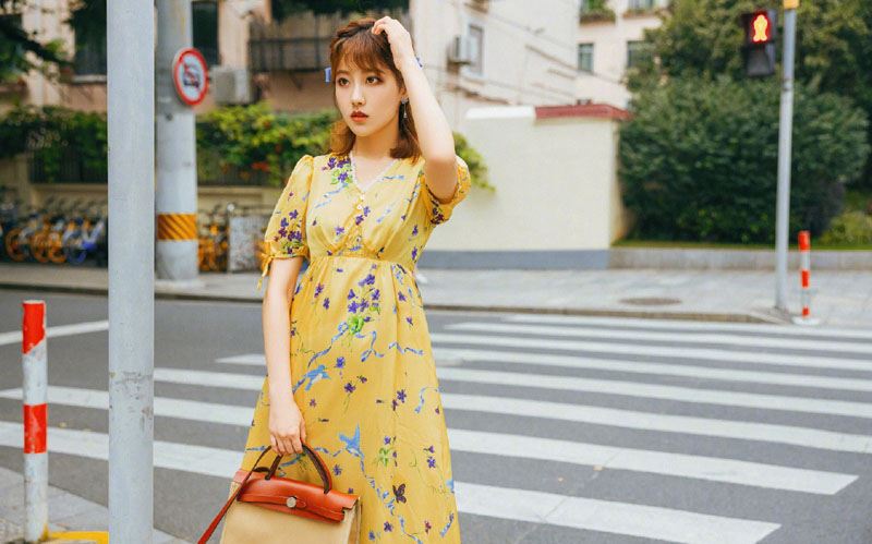 李艺彤印花黄色长裙清新灵