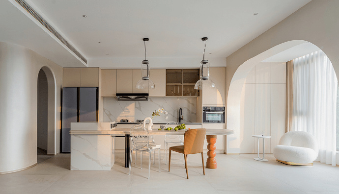 整体奶油白搭配原木色的
